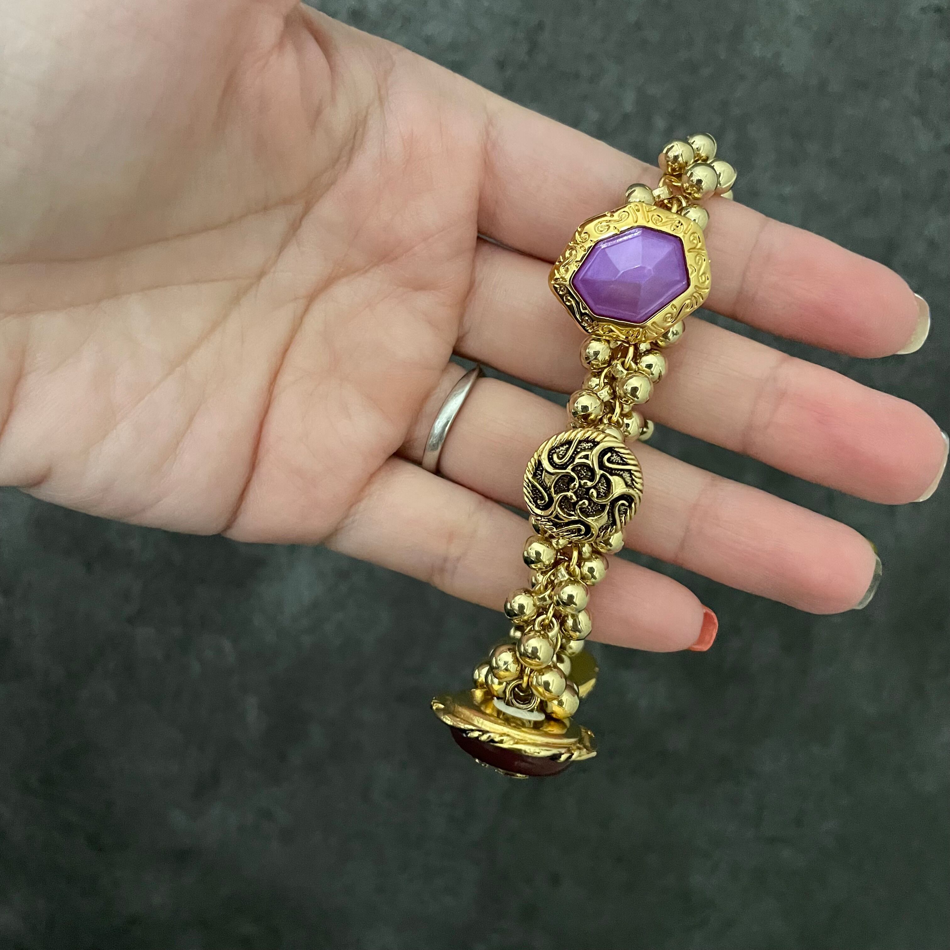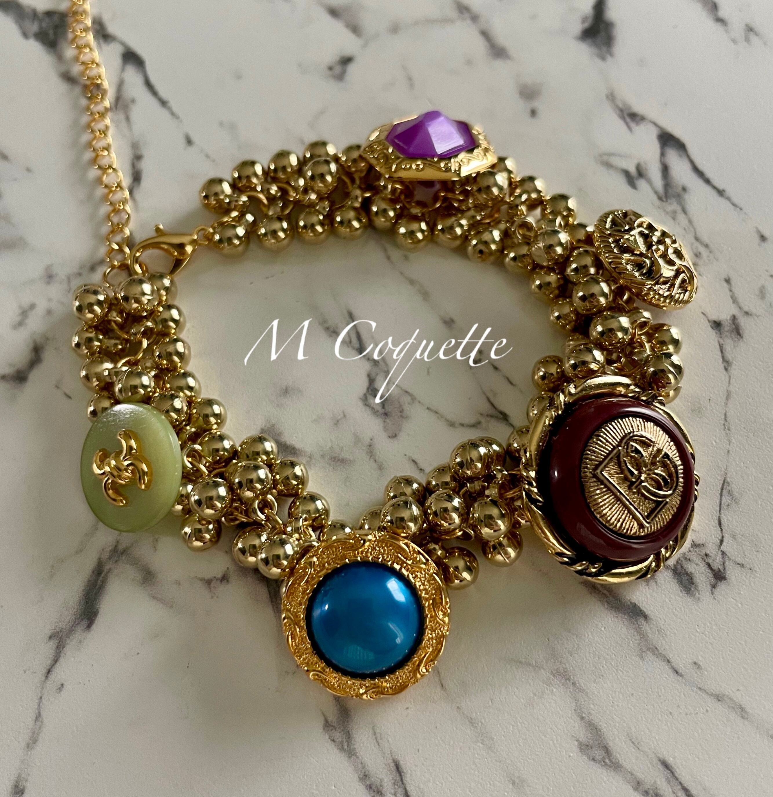 ヴィンテージボタン、インポートボタン、染ボタンとゴールドパーツを合わせて作ったボリューム感たっぷりのブレスレットです✨
